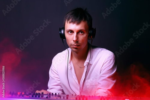 Homem bonito Masculino DJ tocando música no clube em sutiã e óculos escuros tocando música. Fones de ouvido e mixer dj na mesa. Fumaça colorida no fundo, luzes de neon