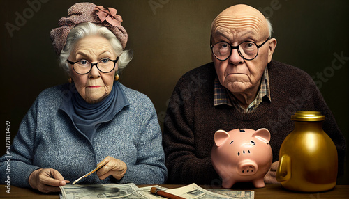 Rentner Paar Ehepaar sitzt vor einem Sparschwein am Tisch Ruhestand Rentenerhöhung Ersparnisse Rente Altersvorsorge reichen nicht aus Generative AI