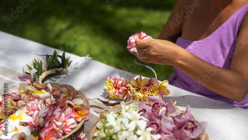 Woman making Hawaiian Lei and Hahu. Process of Handmade flower crown made from Hawaii flower Plumeria.
