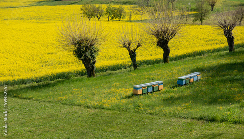 Row of beehives next to yellow rapeseed flower field for pollination and honey production in honeycomb