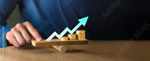 Money leverage and inflation balance. Business man Balancing Stacked Coins With Finger On Wooden Seesaw. Financial concept