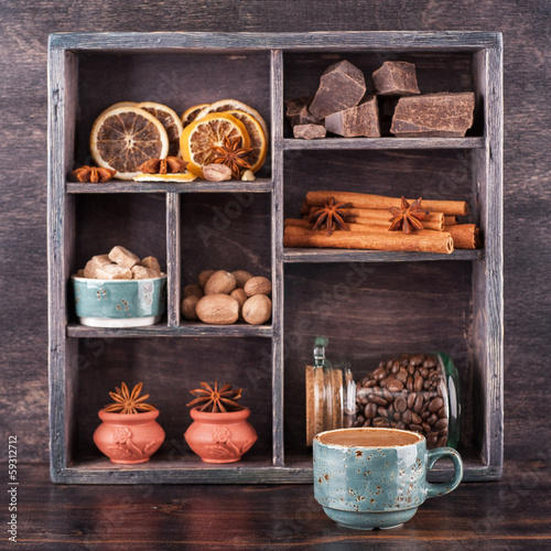 Espresso cup and box with a variety of spices