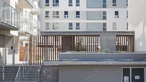 Detal na nowoczesny budynek wielorodzinny w europejskim mieście. Ciekawy układ okien i materiału. Lamele drewniane. Strefa wejściowa