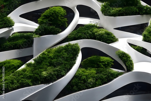 The landscape of a magnificent modern eco-friendly city with terraces covered with green plants. The symbiosis of urban architecture and natural biological life. Generative AI