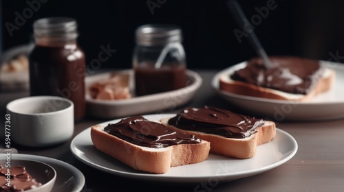Toast with chocolate spread in the kitchen. Delicious breakfast concept. AI generated