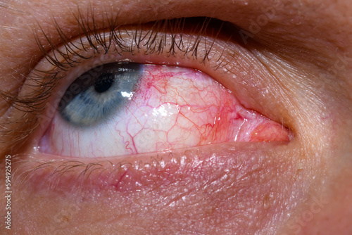 Suche oko z bliska z widocznymi czerwonymi i różowymi żyłkami