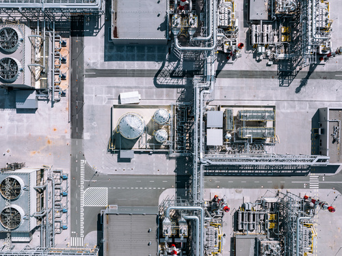 Factory Oil and Gas Refinery. Modern Fuel Energy Factory. Aerial Top View Industrial Site. Industrial Background.