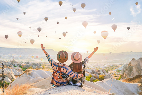 Traveling couple with open arms hugging together and make wish in scenic valley in Anatolia, Kapadokya. Beautiful destination in Nevsehir, Goreme
