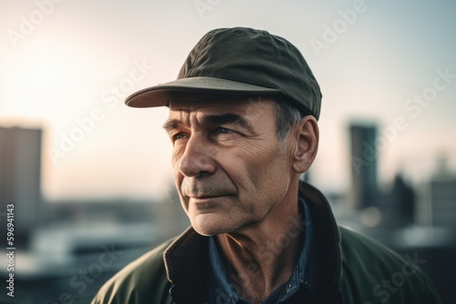 Environmental portrait photography of a pleased man in his 50s wearing a cool cap or hat against a futuristic city or skyline background. Generative AI