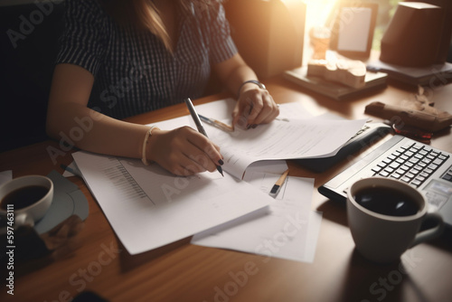 work from home, diary writting. Woman writing on the paper on her desk at home. High quality photo