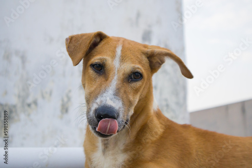 Indian pariah or Indie stray dog of brown color licking it's nose with its tongue out. This local breed of dogs are very loyal and suited to environment of Indian sub-continent.