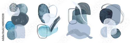Collection of abstract watercolor contemporary art in blue navy tones. Modern design. A set of paint spots, splashes, strokes, smooth shapes and lines. Hand drawn. On a transparent background.