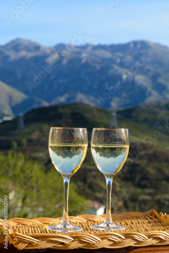 Glasses of swiss or savoy dry white wine with Alpine mountains peaks on background in sunny day