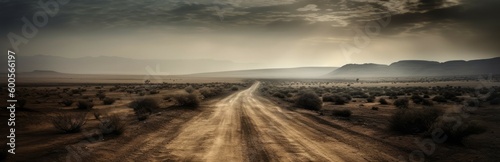 A dusty road leading to vast horizons. Horizontal banner. AI generated