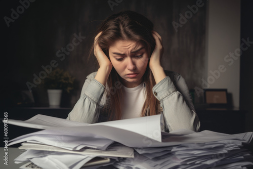 Irritated Woman Holding a Pile of Bills, Stressed About Finances, generative ai
