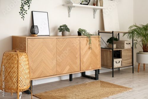 Stylish wooden cabinet with houseplants and blank frame in interior of room
