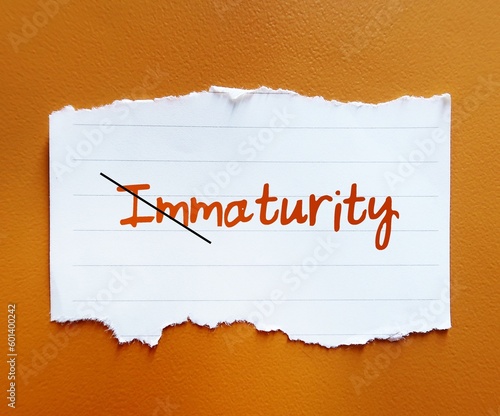 Torn paper on orange background with handwritten text cross off IMMATURITY to MATURITY, means to improve from being person who thinks and acts like child to be immature, think and act like adult