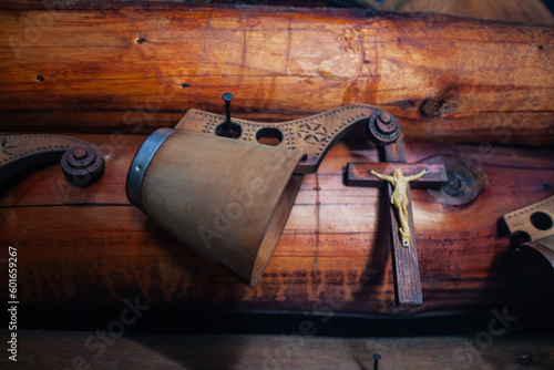 Bacówka w Dolinie Kościeliskiej. Krzyż zawieszony na drewnianej ścianie między naczyniami góralskimi.