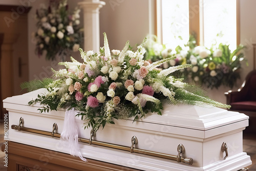 White coffin with a flower arrangement in church. Generative AI.