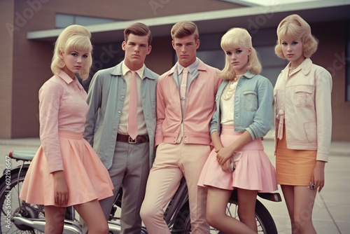 A group of retro 60s students posing on the pastel background. Retro hairstyle and clothing in pastel colors. Generated AI.