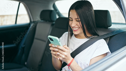 Young beautiful hispanic woman passenger using smartphone sitting on car at street