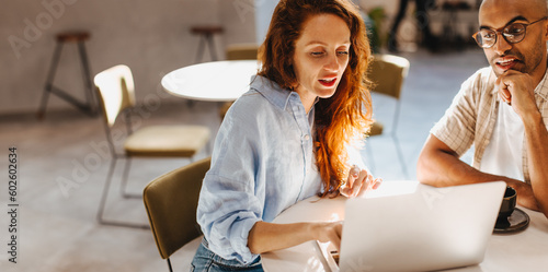 Discussing business in the cafe: Colleagues working with a laptop in a brainstorming meeting