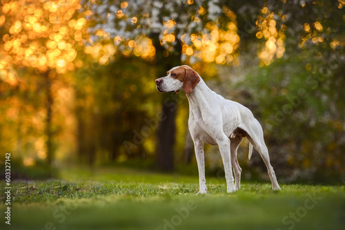beautiful white and red english pointer dog posing at sunset outdoors