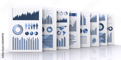 ビジネス資料の横並び、ビジネスデータをプリントした複数の資料