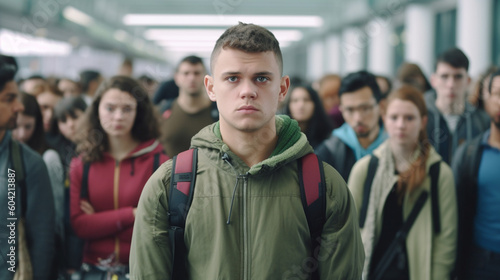bad mood, crowd, dense crowd or queue, fictional place and happening, young adult people. Generative AI
