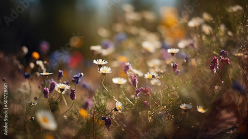 Multi-colored beautiful wildflowers bloom on a green meadow. Warm summer evening. Generative AI