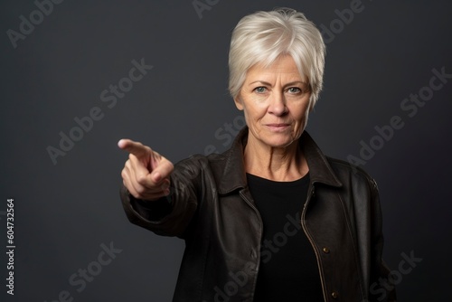 Commanding attention with a pointed finger, a mature woman exudes confidence and authority. Ai Generated.