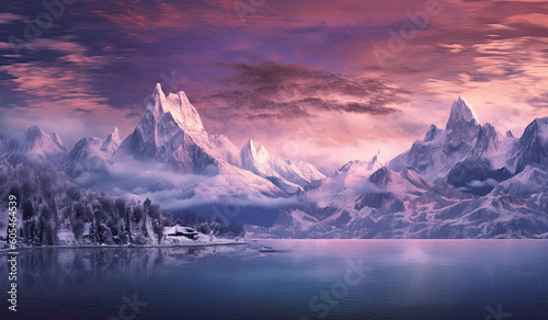 paisaje de un mundo irreal en tonos purpuras con montañas nevadas. Ilustracion de IA generativa