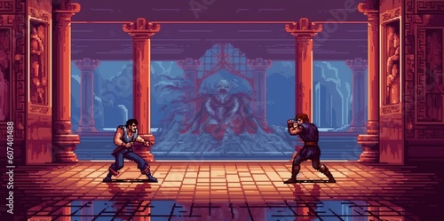 A retro computer game fighter level. Pixel art arcade video. Generative AI