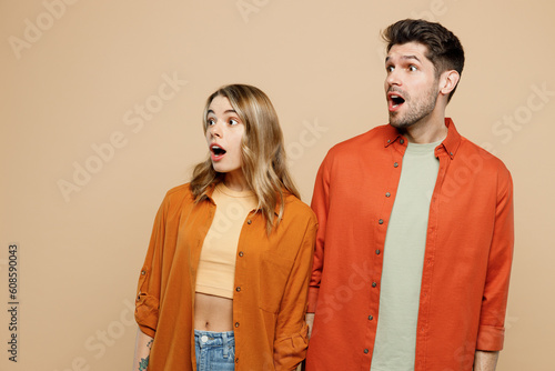 Young shocked surprised amazed impressed couple two friends family man woman wear casual clothes looking aside on area together isolated on pastel plain light beige color background studio portrait.