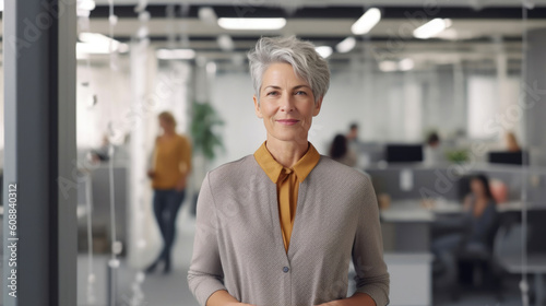 Confident Female Executive Posing in Open Office Space. Generative AI