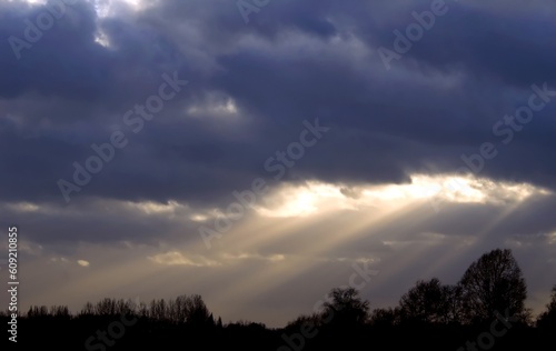 sunrays burst through dense clouds and fall upon forest