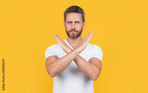 man refuse with denial gesture in studio. photo of denial man show refuse. man refuse and denial.