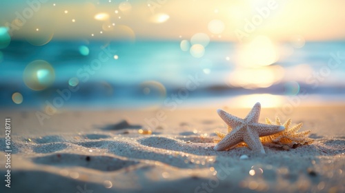 Tropical summer sand beach and bokeh sun light on sea background. Generative AI