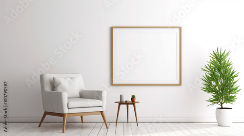 Minimalistisch eingerichtetes Zimmer mit Interieur aus einem Stuhl, Beistelltisch, Pflanze und einem leerem Bilderrahmen an der Wand als Template (Rahmenvorlage) für Poster, Gemälde etc. (Gen. AI)