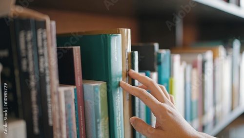 Close up hand search for book on bookshelves in the library. Select a book on shelf. Studying knowledge education in bookstore