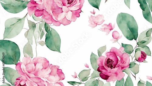 Watercolor floral seamless border green leaves, burgundy maroon pink peach blush white flowers leaf branches. Wedding invitations, greetings wallpapers. Eucalyptus, olive, rose, peony, generative ai