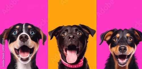 Collage of multiple headshot photos of dogs on a multicolored background of a multitude of different bright colors, shop banner