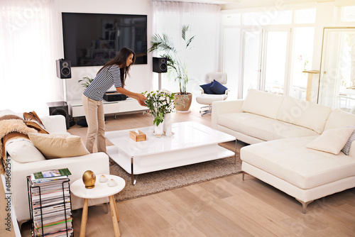 Young woman, tidy living room and home with plants, interior design job or cleaning service with style. Girl, house and organized for clean lounge, furniture or apartment with flower bouquet on table