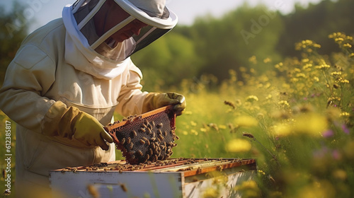 beekeeper collects honey. The process of collecting honey in the apiary. AI generated