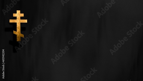 Liturgic black velvet with golden Christian Russian Orthodox Cross. 3D illustration copy space background for worship live stream church sermon. Concept of weekday funerals, memorials, and liturgies.