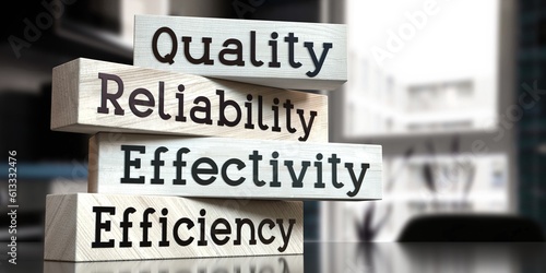 Quality, reliability, effectivity, efficiency - words on wooden blocks - 3D illustration