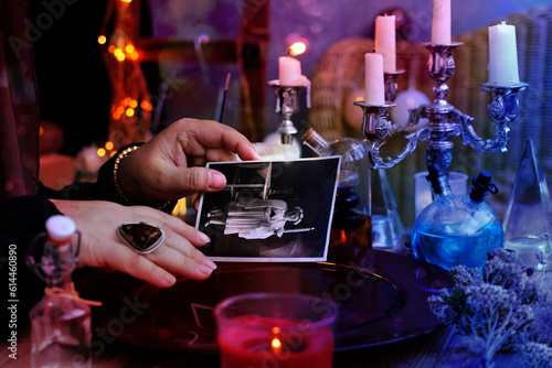 spiritualistic seance in salon of medium with old photographs of deceased relatives, Female Fortuneteller or esoteric Oracle, longing for ancestors, communication with world spirits, help of ancestors