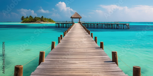 Wooden jetty that juts out into paradise tuquoise waters. Generative AI
