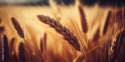 Ripe ears of wheat on the field, close-up. Generative AI