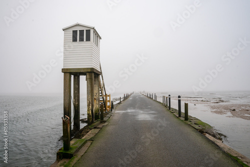 Droga na Holy Island podczas odpływu, pochmurny bardzo mglisty poranek.